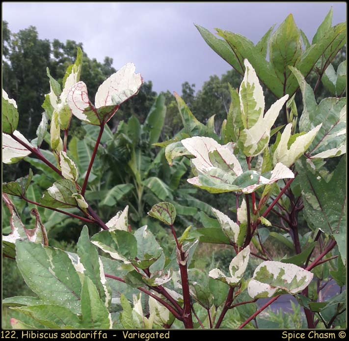 Large variegated plant, ideal for the horticulture market. Given the parents' qualities, once variegation is stabilized, variegated pink calyx will be the ultimate goal for culinary aesthetically pleasing calyces.